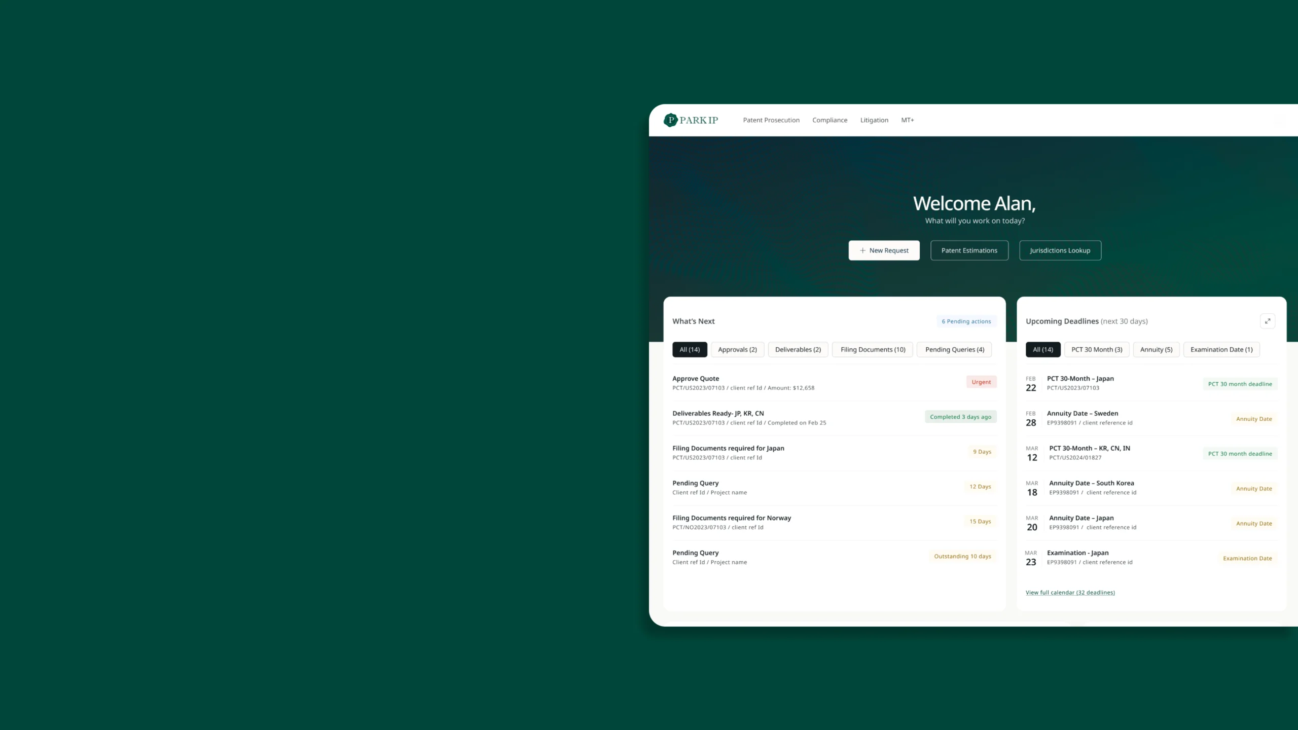 Manage and track patent filings across jurisdictions through a single, centralized environment, reducing manual coordination and administrative burden.